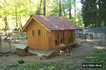 Seit den Osterferien 2001 ist unser neues Hundehaus im Waldgehege fertiggestellt und von unseren Gaesten bezogen worden. Alle unsere Auslaufgehege sind mit automatischen